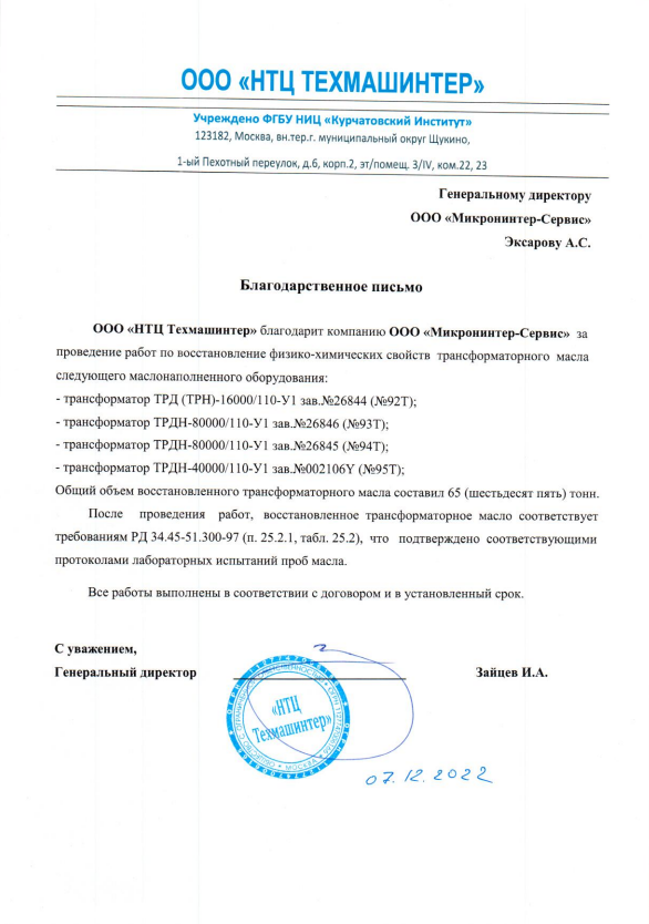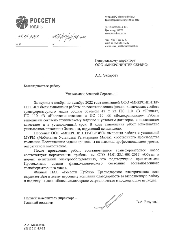 Проведены полноценные работы по очистке и регенерации эксплуатационного трансформаторного масла на объектах НИЦ «Курчатовский институт» и трех подстанциях ПАО Россети Кубань: «Южная», «Нововеличковская» и «Водохранилище» и предоставлены результаты сертифицированных анализов